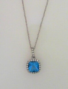 Ladies 14Karat White Gold Fashion Necklace 1.78tw Square Cushion Blue Topaz 0.20tw Round H/I SI3 Diamonds with 18" Chain