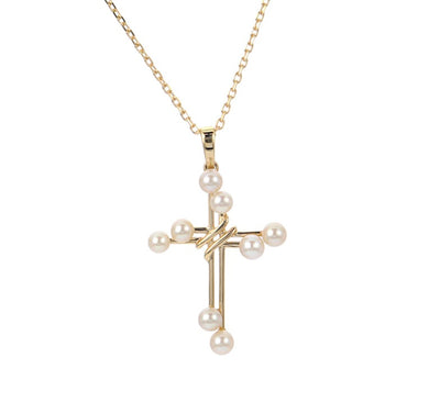 Ladies 14 Karat Yellow Gold Cross with 8 Seed Pearls 18"