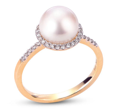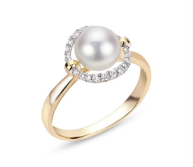Ladies 14 Karat Yellow gold 8-8.5MM Akoya & Diamond Halo Ring with 0.18 Pts TW Size 7