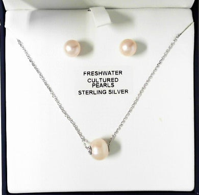 Sterling Silver 7-7.5 MM Freshwater Cultured Pearl Earring/Solitaire Necklace Set 18"