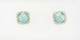 Ladies 14 Karat Yellow Gold Bezel Set Studs With = 2.75Tw Square Cushion Blue Topazs And = 0.07Tw Round G/H Si2 Diamonds