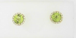 Ladies 14 Karat Yellow Gold Halo Studs With = 2.00Tw Round Peridots And = 0.08Tw Round G/H SI2 Diamonds