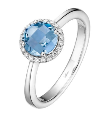 March Birthstone Ring Sterling Silver Rhodium Plated 1.05 TW with Simulated Stone and a Lassaire Stone Halo Size 7