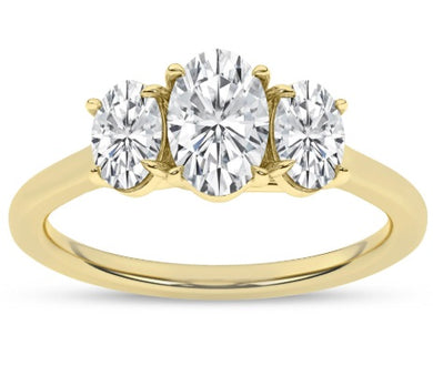 Ladies 14 Karat Yellow Gold Diamond Three Stone Ring With = 1.50Tw Oval F VS1 Diamond Center Stone w 2- .75 pt E/F Color VS1 Ovals =1.50Tw Lab Grown IGI Certification #55J270252508 Size 7 =3.00CTW